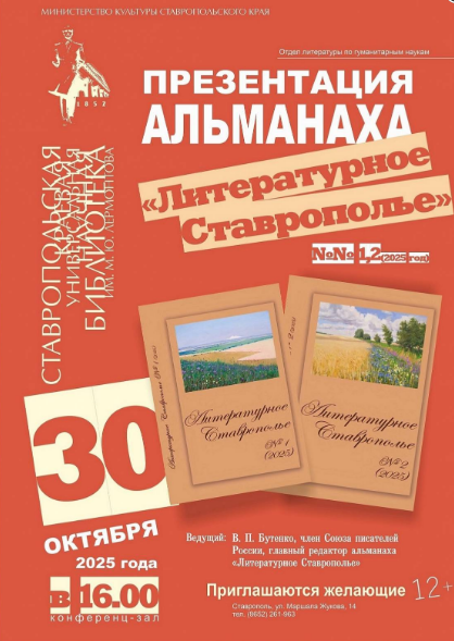30 октября 2025 года в 16 часов библиотека им. М.Ю.Лермонтова приглашает на презентацию новых номеров альманаха «Литературное Ставрополье» за 2025 год. Альманах выходит при поддержке Правительства Ставропольского края и пользуется заслуженной любовью со стороны читательской аудитории, являясь «флагманом» ставропольской литературы.